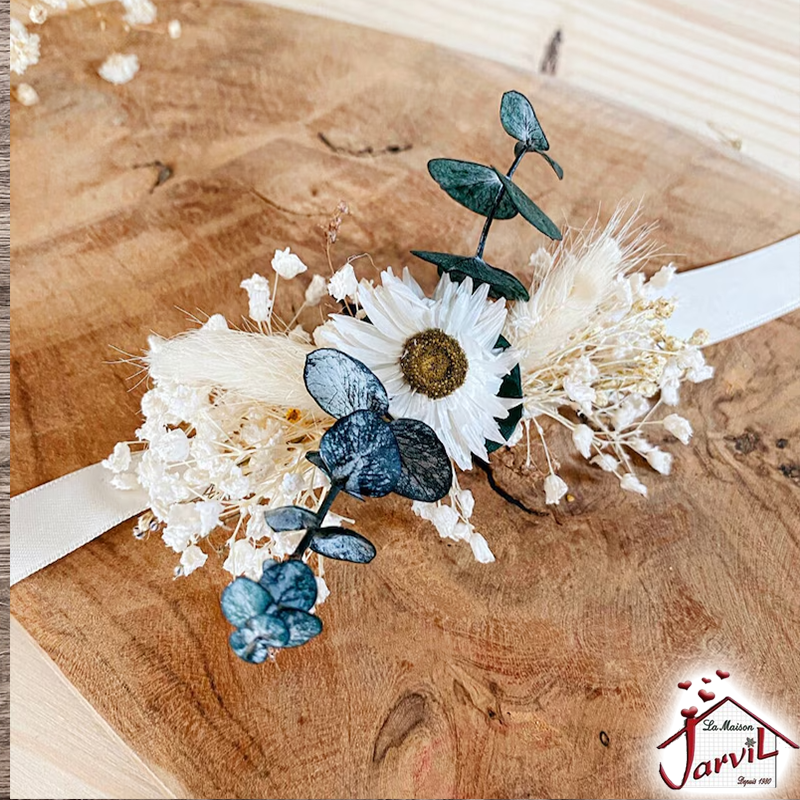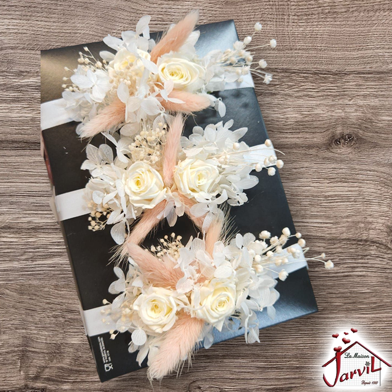 Ce petit bijou floral est composée de fleurs séchées et de fleurs stabilisées (Roses, Hortensias, gyposhile..)